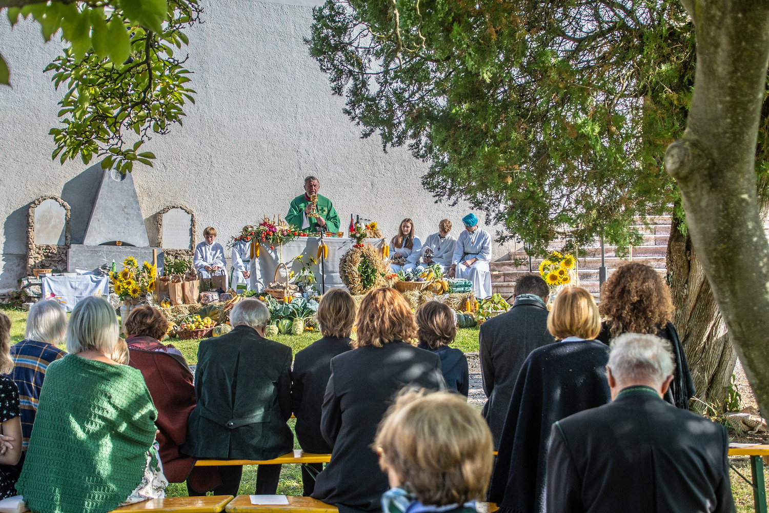 Am Sonntag, dem 3.10.2021, feierte bei strahlendem Herbstwetter die Pfarrbevölkerung von Deutschfeistritz mit Pfarrer Dr. Horst Hüttel das Erntedankfest. Ein von unseren Bauern, vom Obstbauverein und vom Imkereiverein festlich geschmückter Altartisch bildete den Mittelpunkt dieser Feier. Die Marktmusikkapelle trug zur festlichen Gestaltung der Hl. Messe wesentlich bei.
