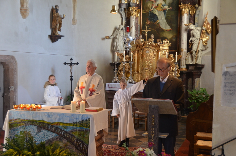 Bei der Allerheiligenlitanei wurden die Heiligen unserer Filialkirche angerufen, wobei die Ministranten auf ihr Bild dabei zeigten.