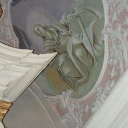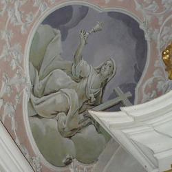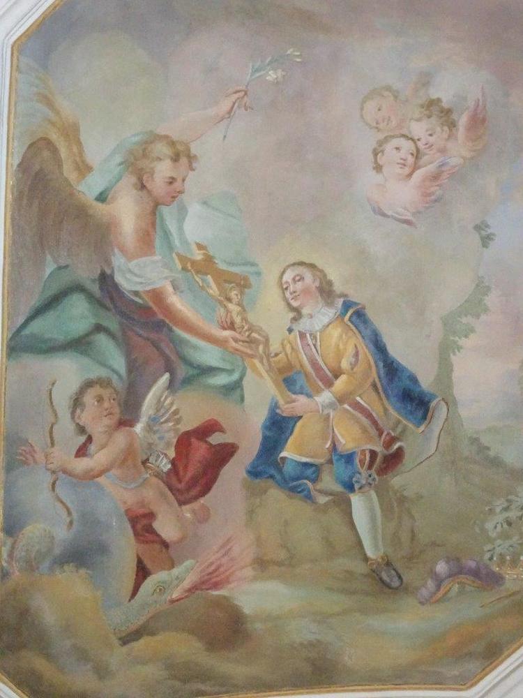 Der Kapellenraum besteht aus einem Tonnengewölbe mit zartem, besonders reich ausgebildetem Rokokostuck, der den italienischen Einfluss verrät. Die beiden Bildfelder sind mit Szenen aus dem Leben des Heiligen ausgestattet und stammen ebenfalls vom Künstler J.A. Mölk. In den vier Ecken befinden sich Bildfelder in Grau-Weiß-Schwarz-Maltechnik mit der Darstellung der drei göttlichen Tugenden (Glaube, Liebe, Hoffnung) sowie einer Pieta.