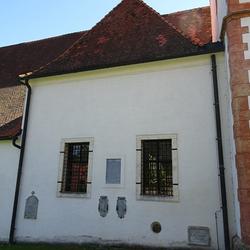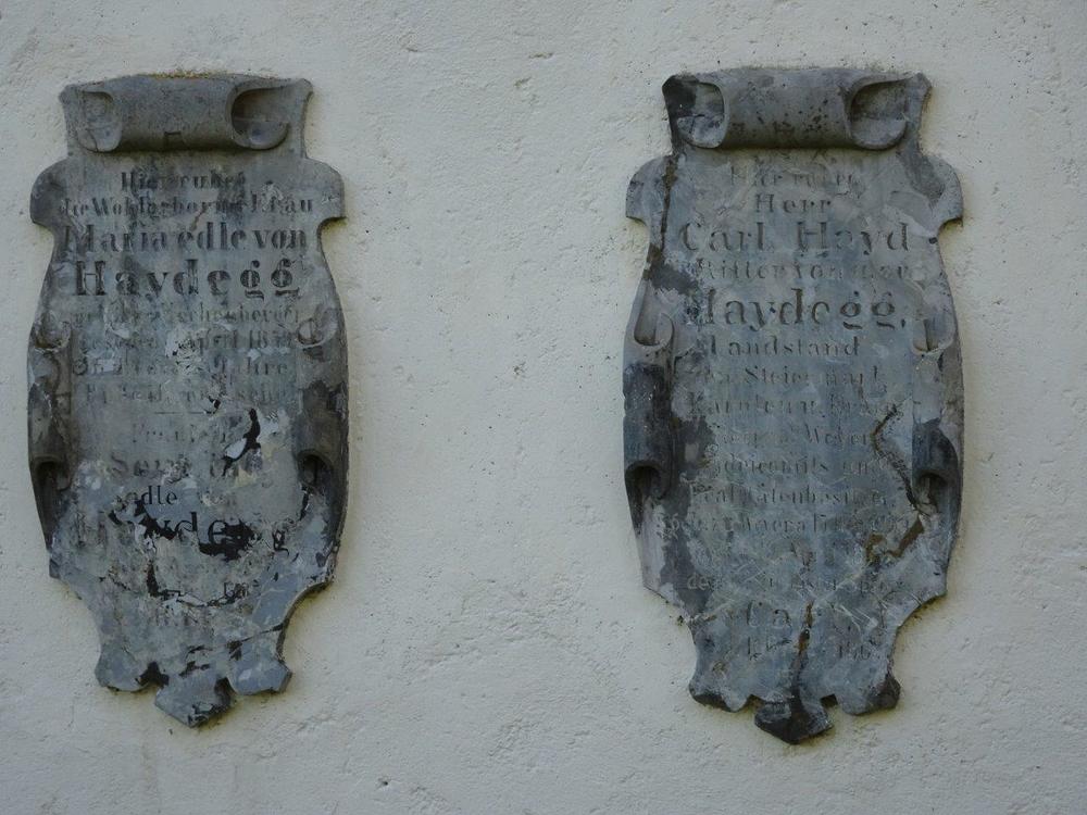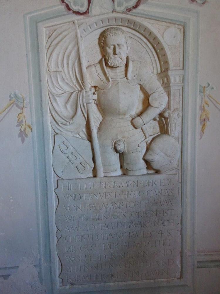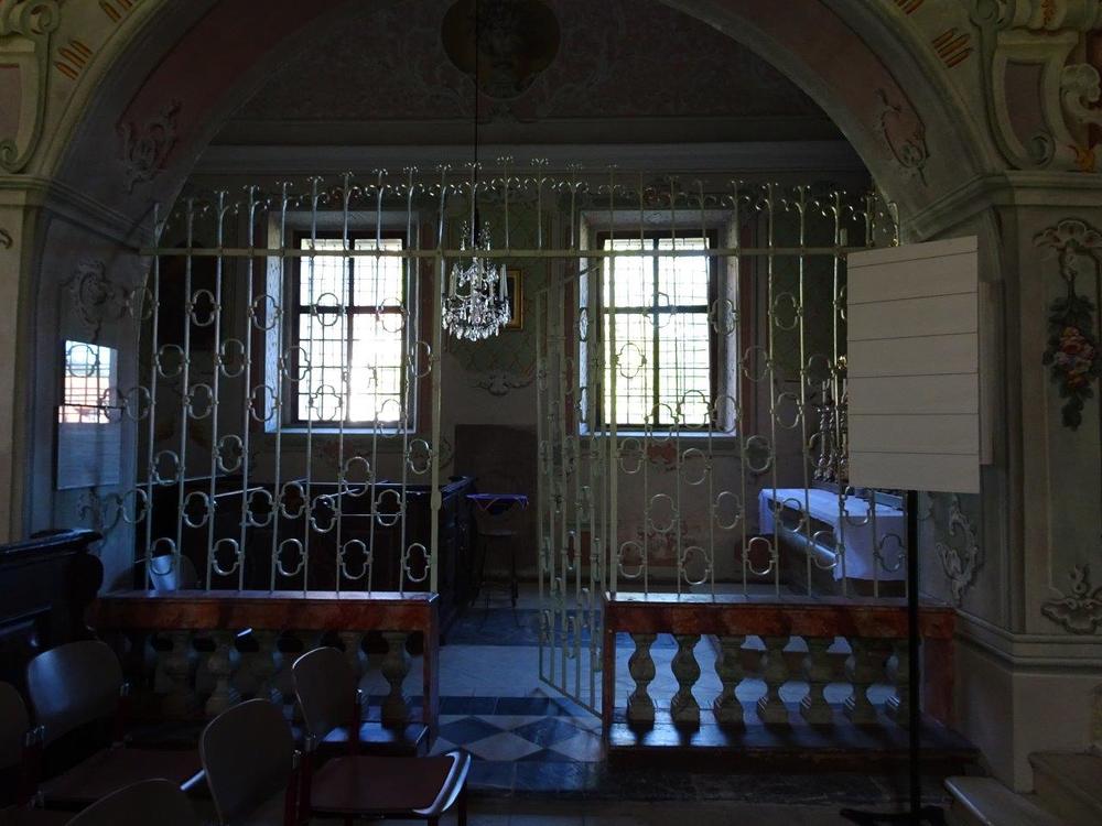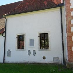 An der Rückwand ist ein Renaissance-Grabmal für Kaspar von Radmannsdorf (gestorben 1584) in weißem Marmorrelief mit Halbfigur in voller Rüstung sichtbar. An der Nordwand befindet sich eine stark verwitterte Marmorgrabplatte für den 1480 verstorbenen Barthlme Lichnider und dessen Gattin. Auf dem Fußboden weist eine große Steinplatte auf die von den Redemptoristen darunter angelegte Priestergruft hin.